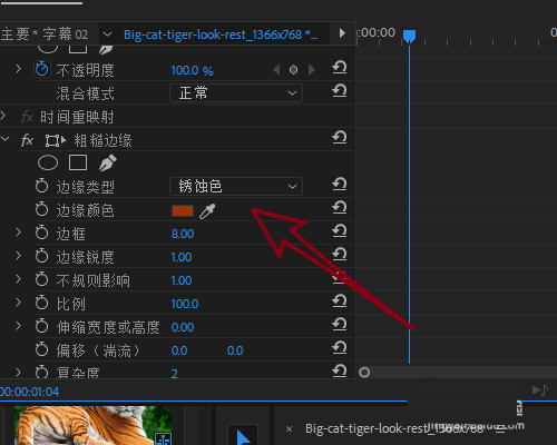 8、選中字幕01,打開效果控制面板,邊緣類型設置為銹色,