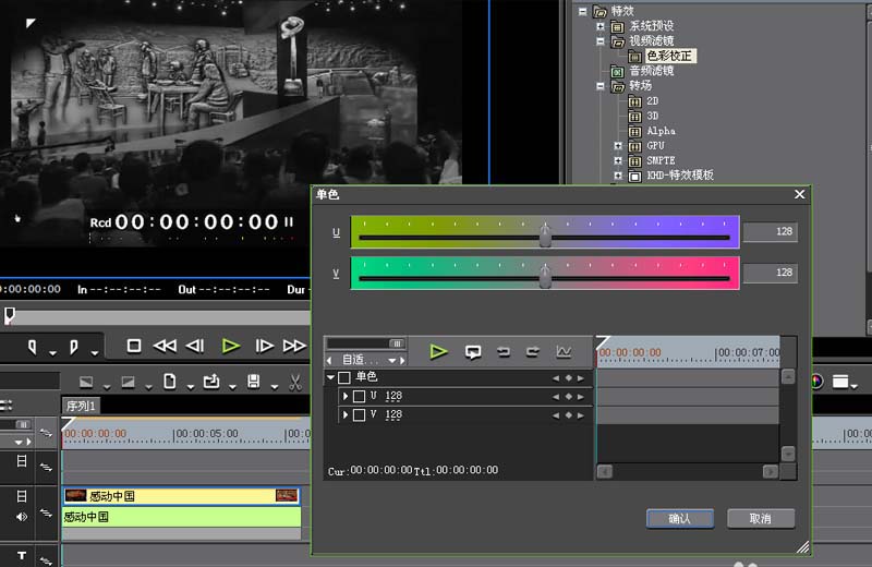 5、在單色對話框中勾選單色,并對u和v分別添加關鍵幀,選擇一定的時間段,再次添加關鍵幀。