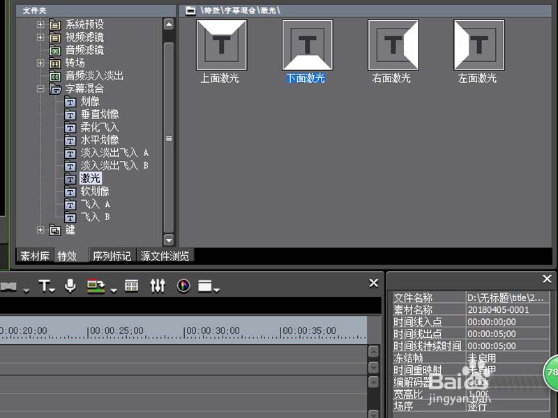 4、切換到特效庫,從字幕混合中選擇激光,接著拖拽下面激光到t軌道上。