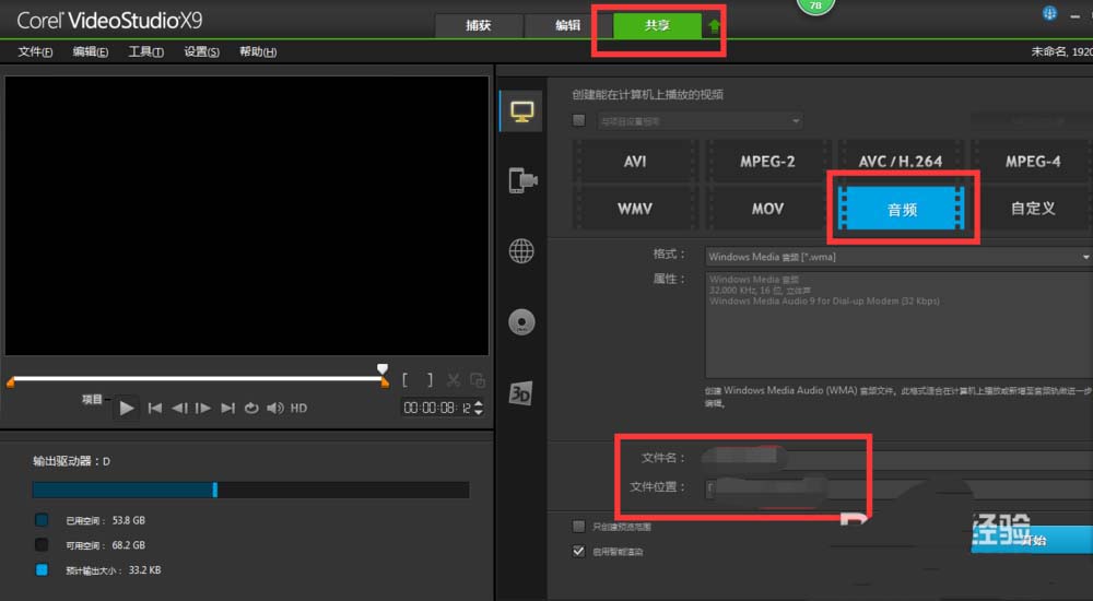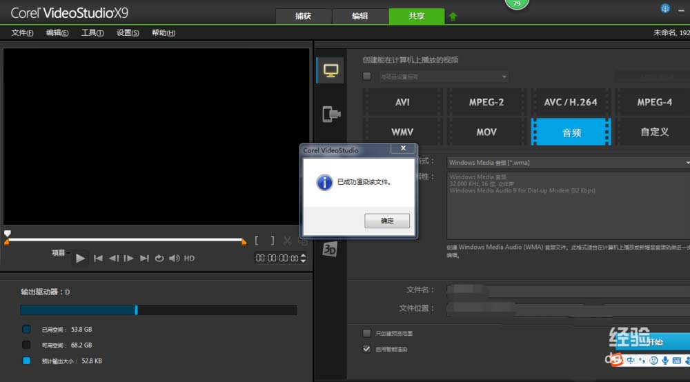 6、再點擊共享、創設音頻文件,設置好文件名和文件位置,再點擊開始。音頻開始渲染,當軟件中跳出已成功渲染該文件,卡通聲音就調好啦。