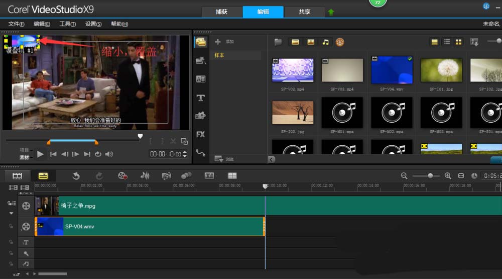 3、將覆疊軌上的視頻縮小,拖到希望遮擋的文字或者圖案上。