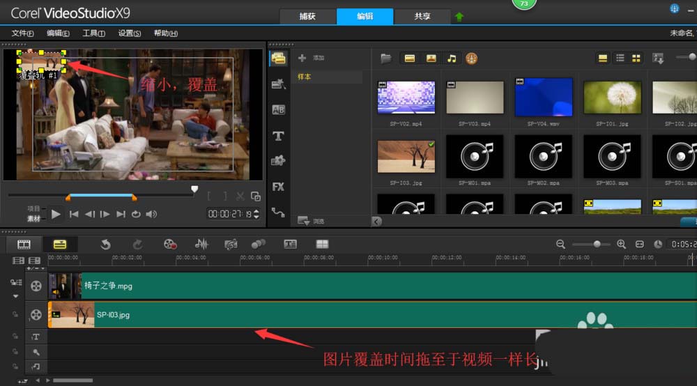 6、把圖片縮小,覆蓋住需要遮擋的文字或者圖案,同時把覆疊軌上的圖片拖到與視頻長度一致。