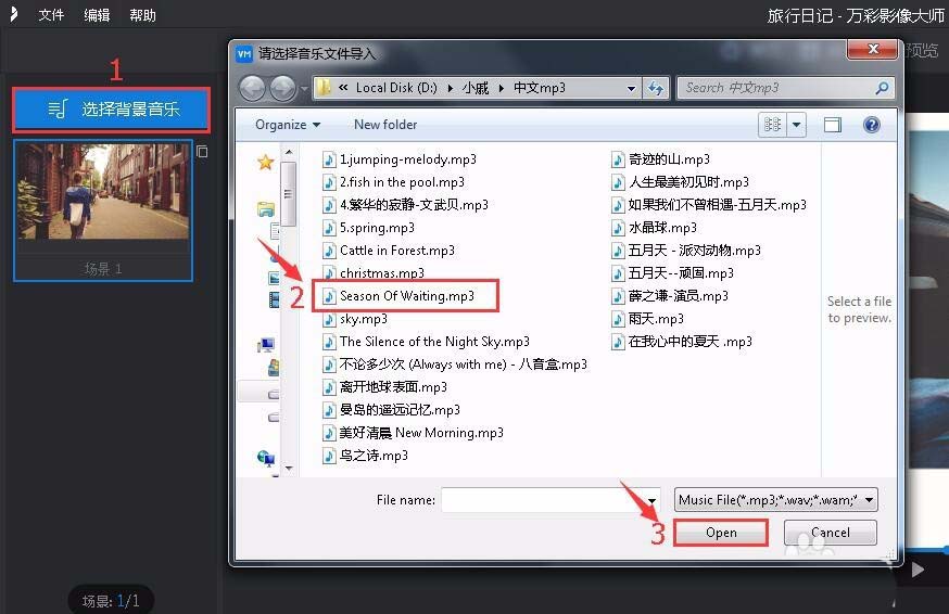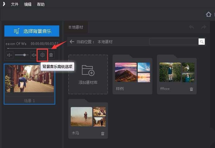 1、點擊主編輯頁面左上方的“選擇背景音樂”藍塊, 然后再打開的文件夾中選擇一首合適的背景音樂, 并點擊“打開”即可導入背景音樂。
