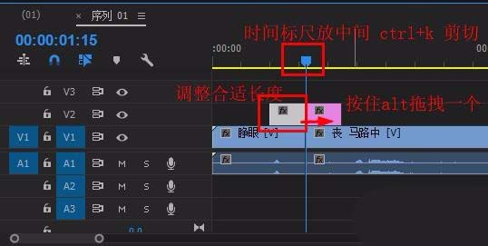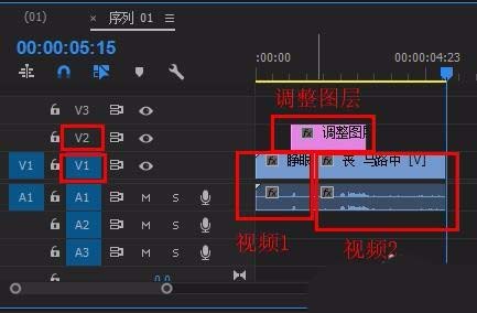 3、將視頻和調整圖拉入軌道。將視頻1、視頻2拖到v1軌道上,調整圖層拖至v2軌道,放在v1和v2中間位置(如圖),將時間標尺放到視頻1的結尾處,選中“調整圖層”,ctrl+k剪切調整圖層,調整圖層長度為一致長度(可調整一個,再復制一個,如圖)