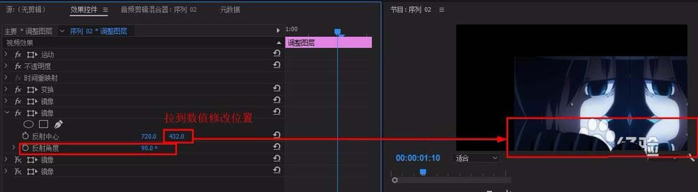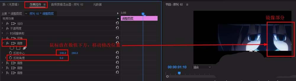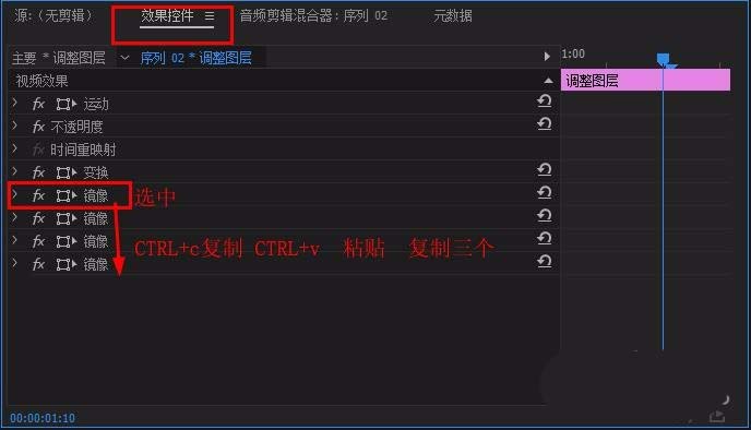 7、復制“鏡像”。選中“調整圖層1”,在“效果控件”面板中找到“鏡像”,選中,ctrl+c復制,ctrl+v粘貼,再復制三個“鏡像”出來