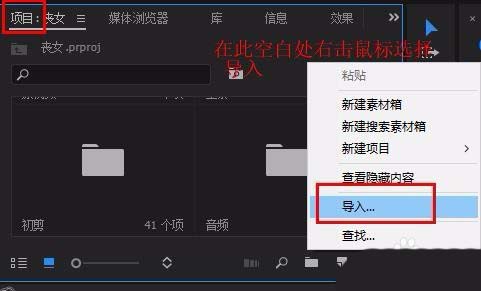 1、導入視頻素材。打開pr軟件,在“項目面板”空白處右擊鼠標,選擇“導入”,將素材視頻1、視頻2導入