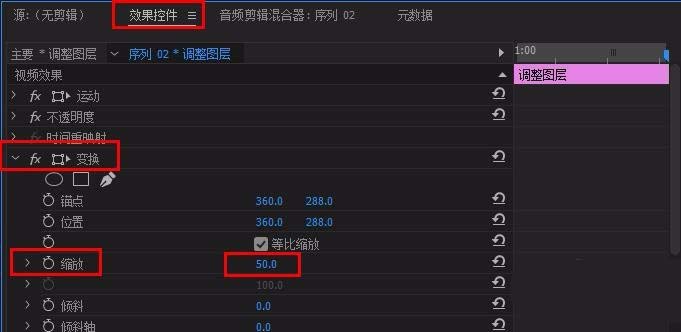 5、縮小視頻大小為50%。選中調整圖層1,在“效果控件”面板中找到“變換”-“縮放”,修改數值為50