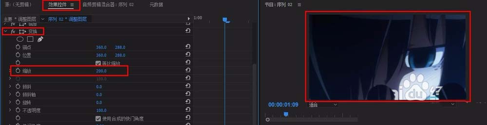 9、再次縮放畫面大小。在“效果”搜索欄輸入“變換”,拉到“調整圖層1”上面,在“效果控件”面板找到“變換”-“縮放”為200,此時畫面變為原始大小,完成。