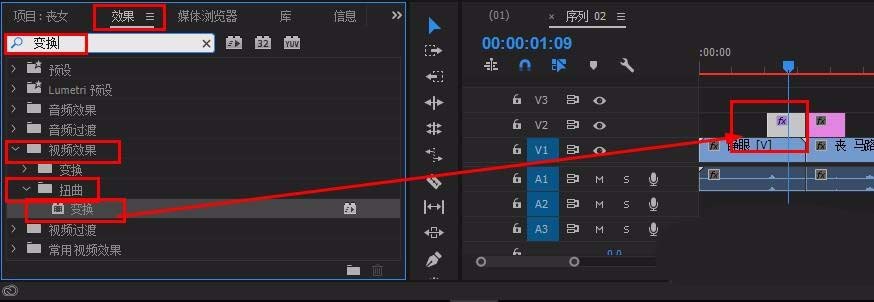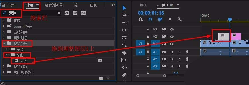 4、拖動“變換”效果到調整圖層1上。在“效果”面板搜索欄輸入“變換”,將其拖到“調整圖層1”上, (“視頻效果”-“扭曲”-“變換”)