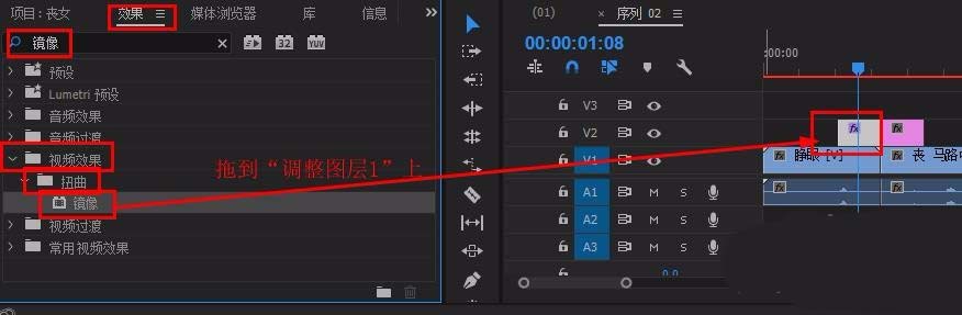 6、為調整圖層添加“鏡像”效果。在“效果”面板搜索欄輸入“鏡像”,將其拖到“調整圖層1”上