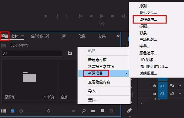 2、新建調整圖層。在“項目面板”的空白處右擊鼠標,選擇“新建項目”-“調整圖層”,點擊“確定”,新建調整圖層