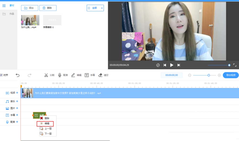 5、點擊這個字幕模板,兩邊把它拖長,就是設置它顯示的字幕的時長。然后右鍵模板選擇編輯。