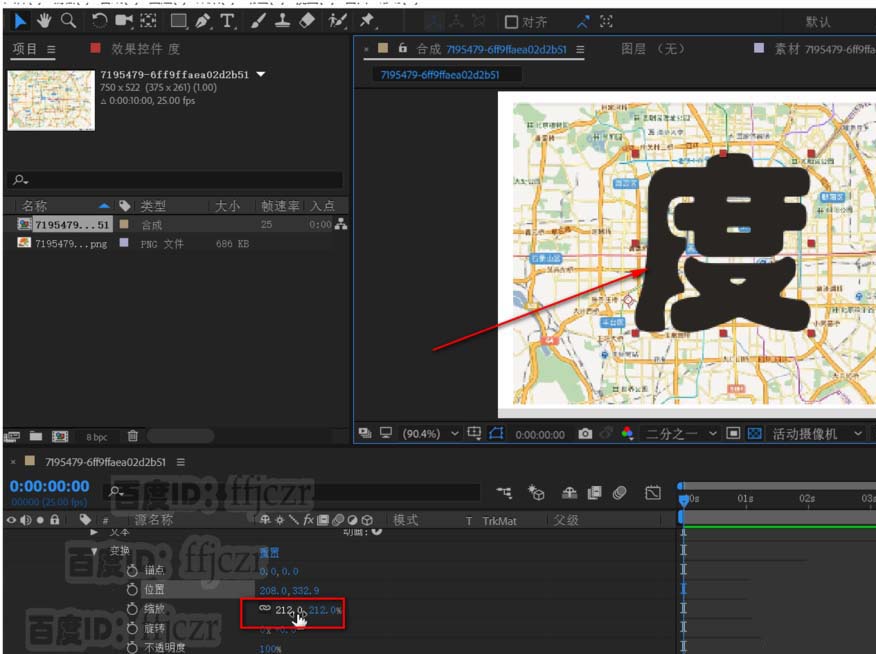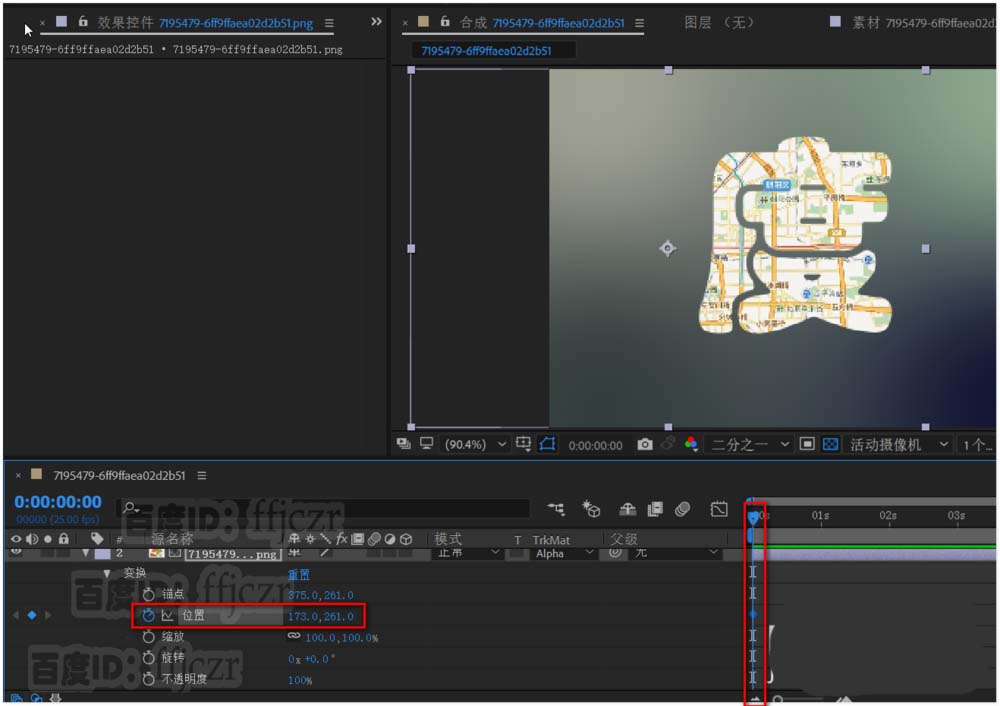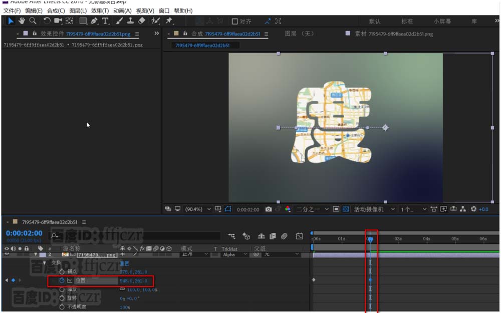 6、展開帶地圖的圖片,激活位置關鍵幀;在時間為0時調整圖片向左移動;在時間為2時調整圖片向右移動。 得到一個圖片移動的動畫。因為文字的遮罩,得到文字內的地圖在移動的動畫。
