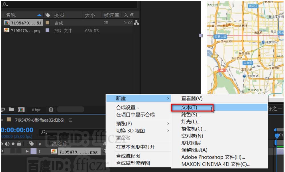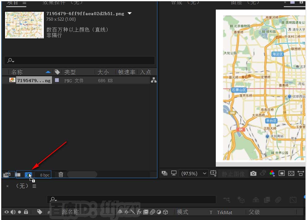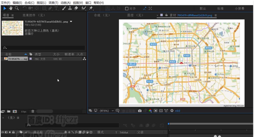 1、首先導入一張有地圖的圖片,并用該圖片拖到合成小圖標處生成一個新的合成。