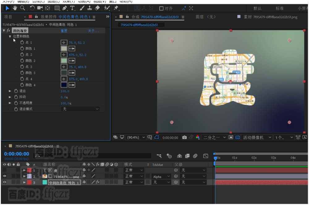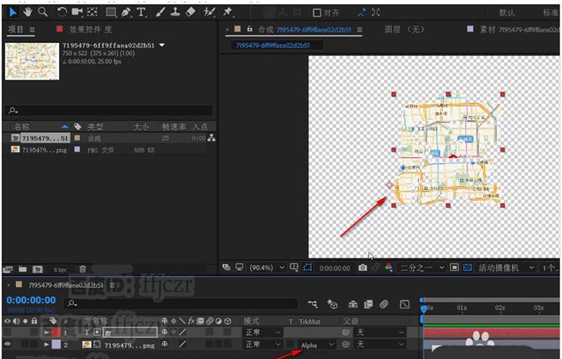 3、在帶有地圖的層中修改軌道蒙版為“Alpha蒙版”。蒙版即刻生效了,但沒有背影。