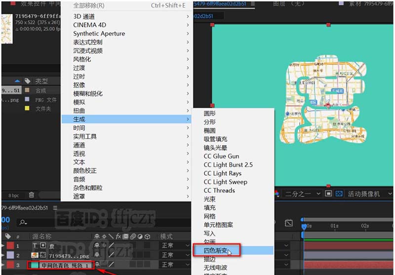 5、選中純色層,點開效果選擇生成中的四色漸變;調整背景色,使文字能明顯分辨出來。