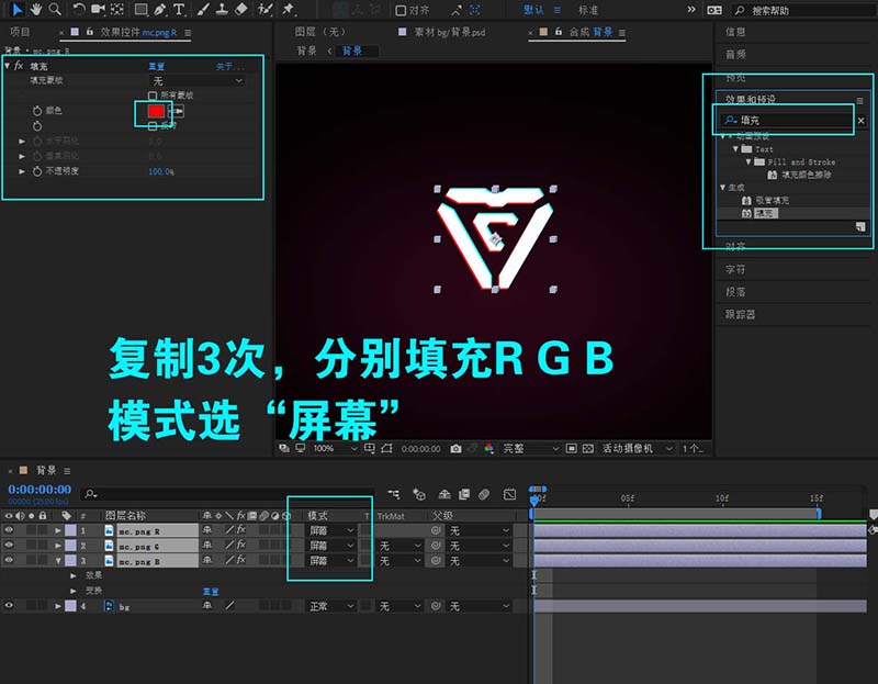 那么在AE怎么做出ps里的效果呢?我們將RGB這三個圖層選中,把模式選成"屏幕"。是不是很神奇。