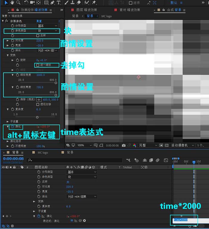 對比度和亮度根據自己喜好調節這里推薦(230,-20),變換(統一縮放 去掉勾)縮放寬度決定 故障效果里故障格子的寬度, 同理縮放高度影響故障格子的厚度,演化 這里出現第二個表達式 time表達式 time*2000