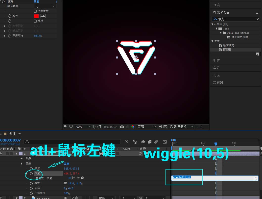 那么,怎么讓這個抖音效果動起來呢。這時候需要用到wiggle表達式,按住 alt鍵 用鼠標左鍵點擊 位置的這個秒表。 右側的時間軸里出現了一個輸入框,輸入wiggle(5,10),注意在寫表達式的時候一定是英文小寫,不然會報錯。