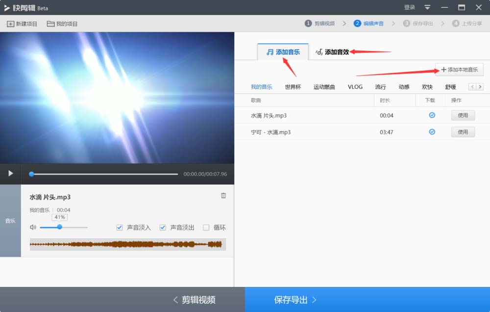 3、導入后點擊下一步添加音頻特效,如圖所示;