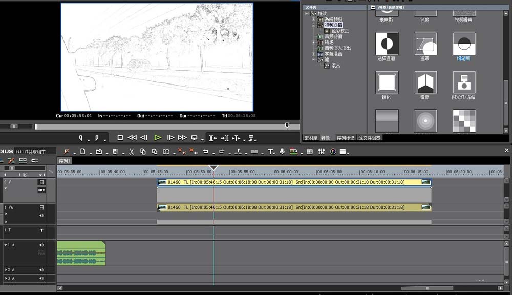 3、把上邊視頻軌的素材添加“鉛筆畫”的視頻濾鏡。直接拖放即可加上。