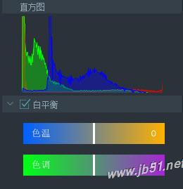 在高級調色工具窗口中選擇“白平衡”選項,在下拉菜單中,你會看到控制色溫和色調的調節器。拽動調節器上的滑塊,負值為應用冷色調,正值為應用暖色調。