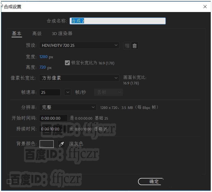 1、新建一個合成項目,分辨率為1280*720;方形像素,25幀率,其它參數如圖所示。