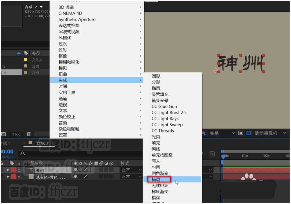 4、選中文本層,給其添加效果、生成列表中描邊。