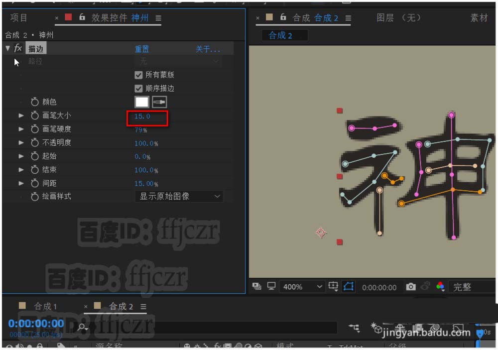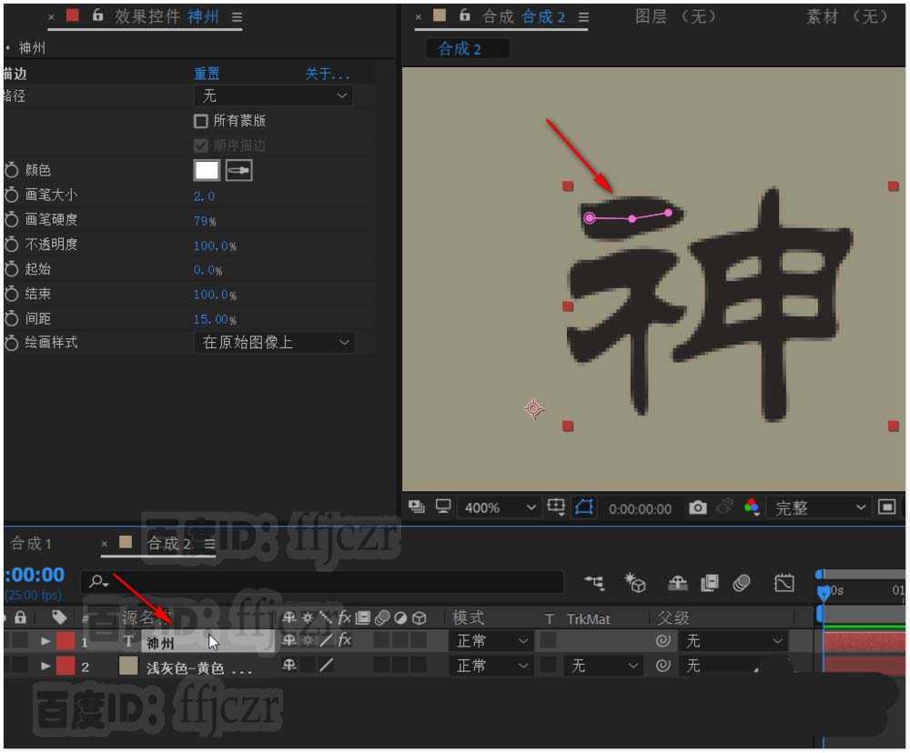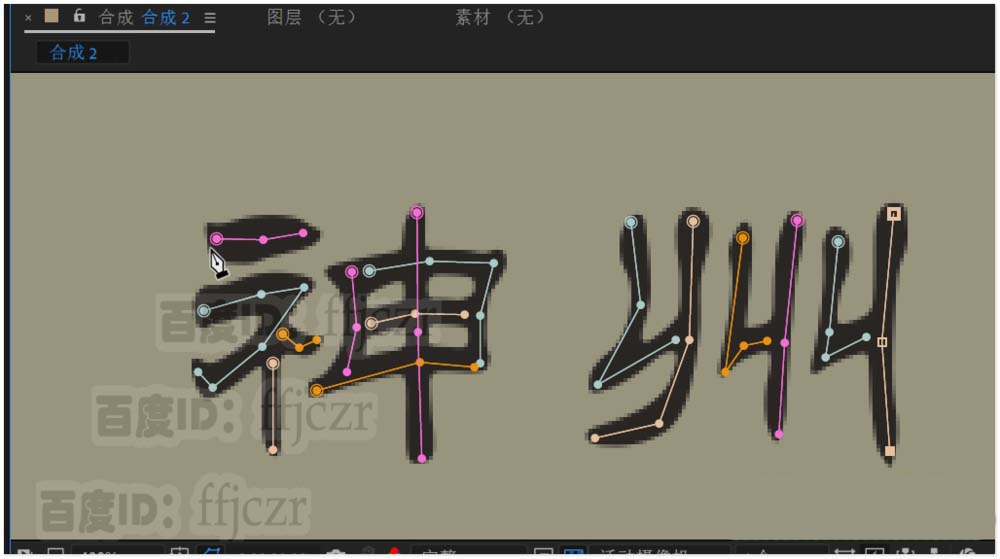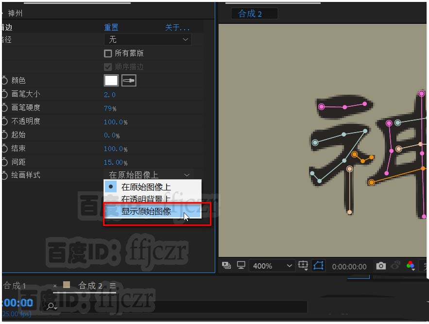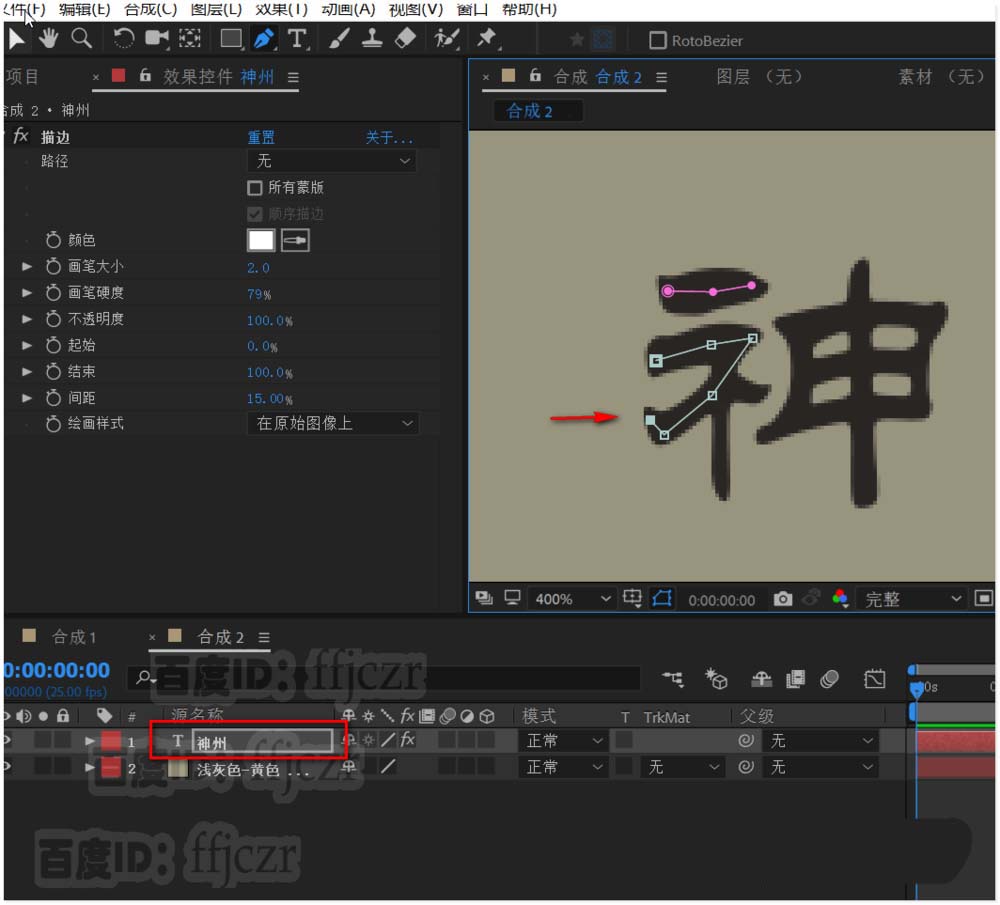 5、繪圖樣式選用在原始圖像上,保持文本層始于選中狀態;選用鋼筆工具,放大文本到合適狀態;用鋼筆工具按文字的筆劃順序描寫一遍。要注意每描完一個筆劃,要重新選取文本層,讓描邊單獨呈現。