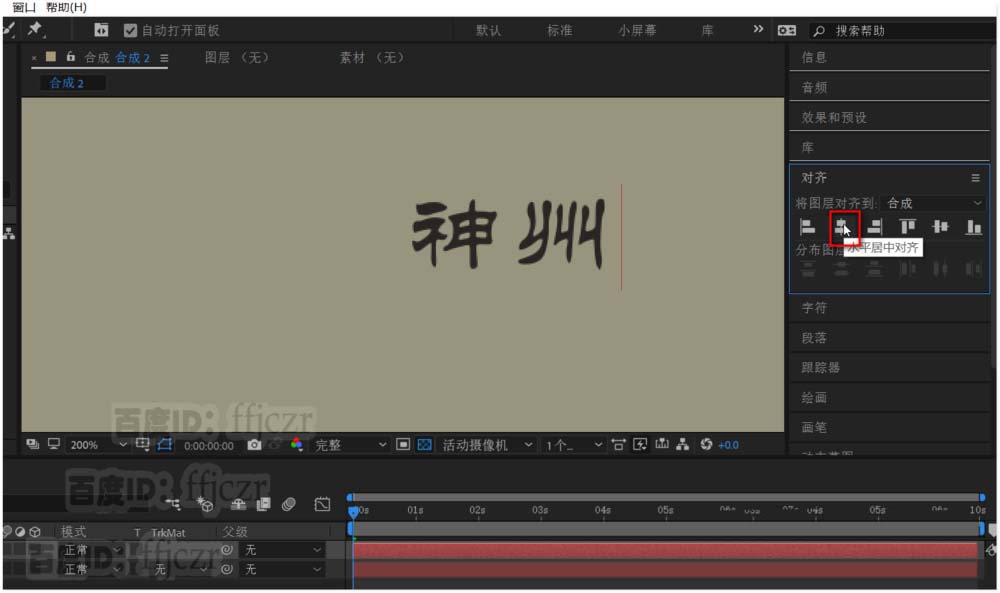 3、在合成層中添加一個文本層,在顯示區輸入相應的文字,調整到合適大小,并將文字居中。
