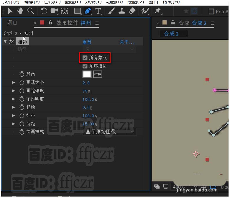 6、在描邊選項欄中,將繪畫樣式改為顯示原始圖像,勾選所有蒙版;畫筆大小調整到15.
