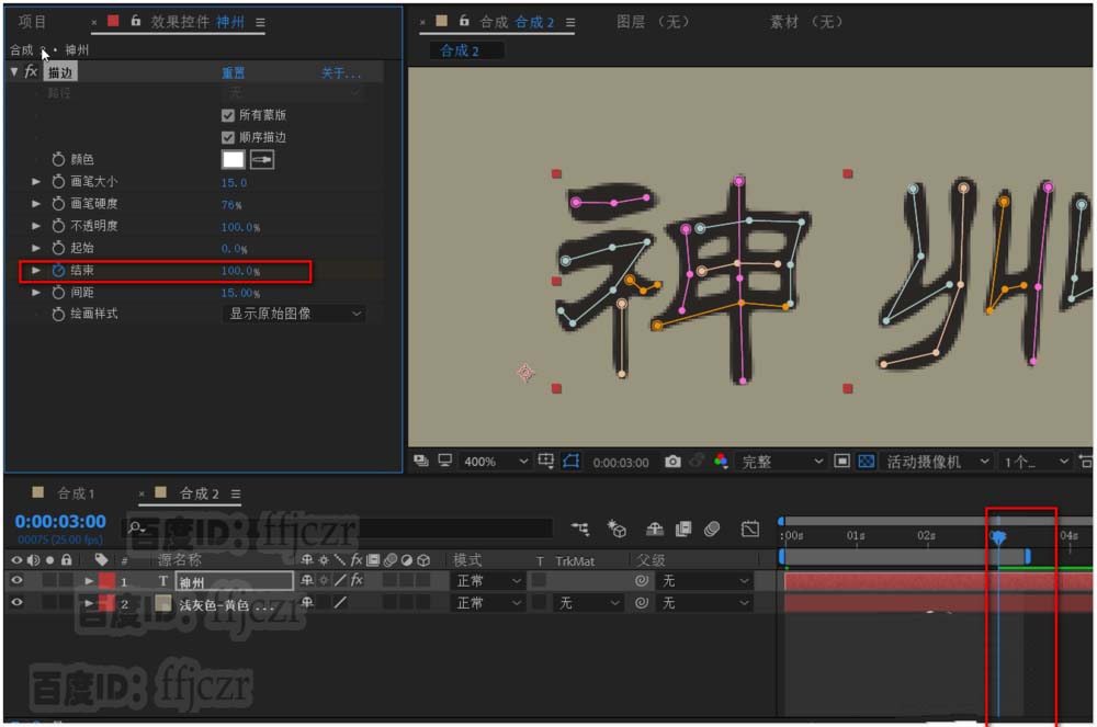 8、時間線為3,結束選項中數值為100%。調整時間線的大小;即可得所要文字顯顯現效果。