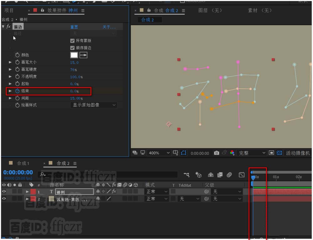 7、時間線在0時,激活結束選項的關鍵幀,數值為0%。
