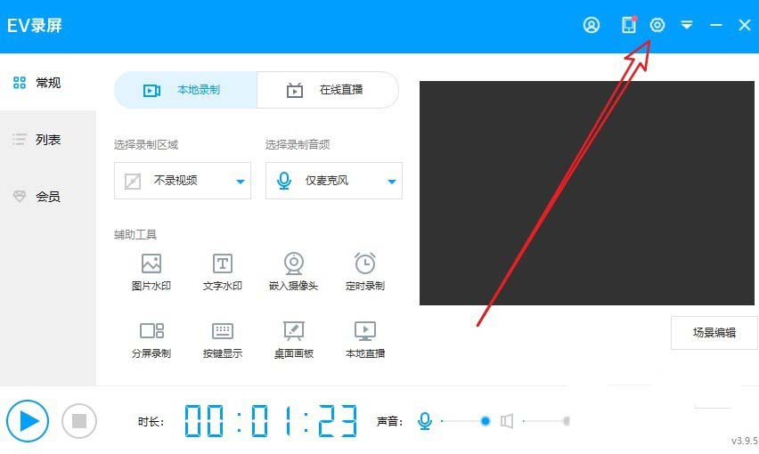 2、我們?cè)诖蜷_(kāi)的Ev錄屏應(yīng)用主界面,點(diǎn)擊右上角的“設(shè)置”按鈕