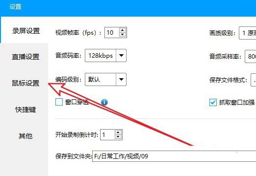 3、這是就會(huì)打開(kāi)Ev錄屏的設(shè)置窗口,在窗口中我們點(diǎn)擊左側(cè)邊欄的“鼠標(biāo)設(shè)置”菜單項(xiàng)。