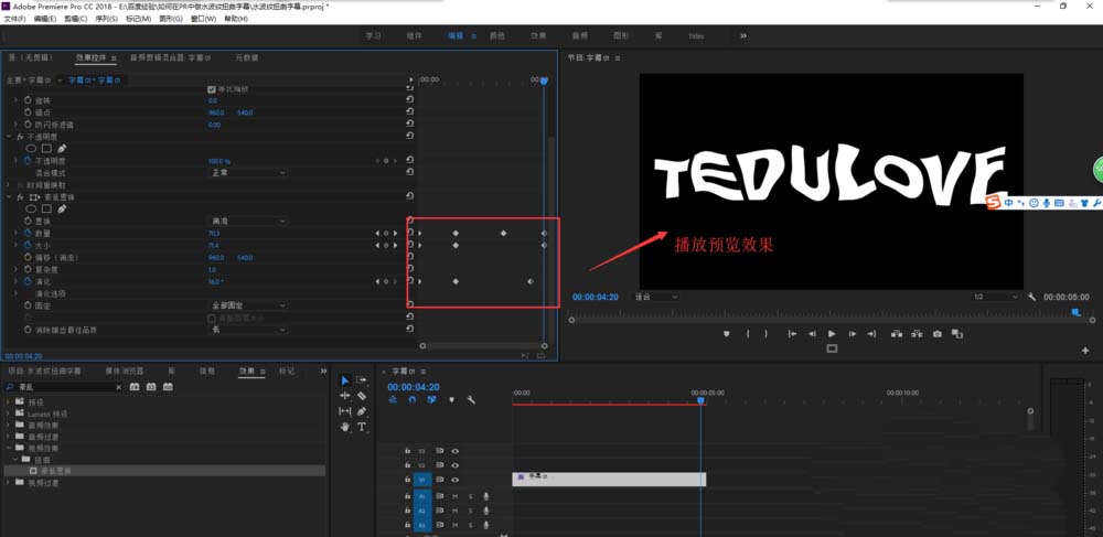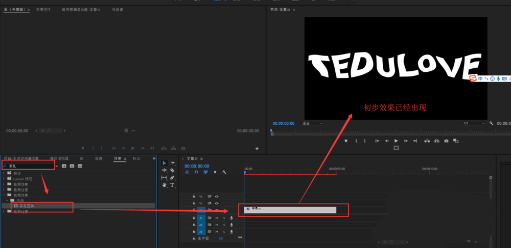 5、打開效果窗口,在效果窗口中搜索關(guān)鍵字“紊亂”,然后會(huì)出現(xiàn)一個(gè)“紊亂置換”的效果,選中該效果將其施加到字幕上,這時(shí)候一個(gè)靜態(tài)的水波紋扭曲效果已經(jīng)出現(xiàn)了,接下來我們將其做成動(dòng)態(tài)的。