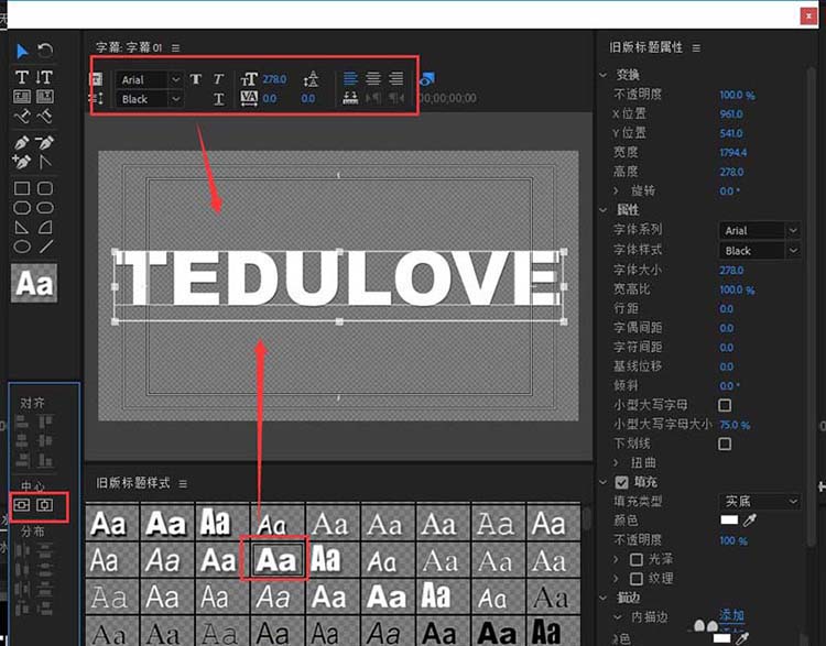3、在自動(dòng)彈出的字幕窗口中先輸入字幕的文本內(nèi)容,然后用選擇工具選中輸入的字幕,在字幕編輯窗口中調(diào)整字幕的大小等屬性,為其添加字幕樣式,并居中與垂直對(duì)齊。