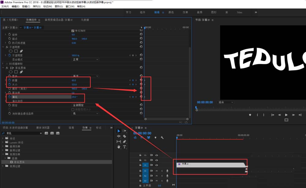 6、選中字幕,打開效果控件窗口,在效果控件窗口中找到“紊亂置換”效果,調(diào)整數(shù)量、大小與演化的數(shù)值,并打入關(guān)鍵幀,然后每移動(dòng)時(shí)間軸一段距離,就隨機(jī)更改這三個(gè)選項(xiàng)的參數(shù)值。最后播放預(yù)覽效果,一個(gè)動(dòng)態(tài)的水波紋扭曲字幕就做好了。