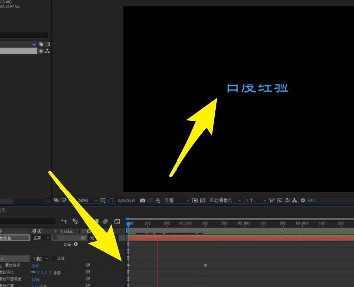 4、打開蒙版路徑。將時間指示線移動到0幀位置,然后將蒙版范圍移動到文字內容外。