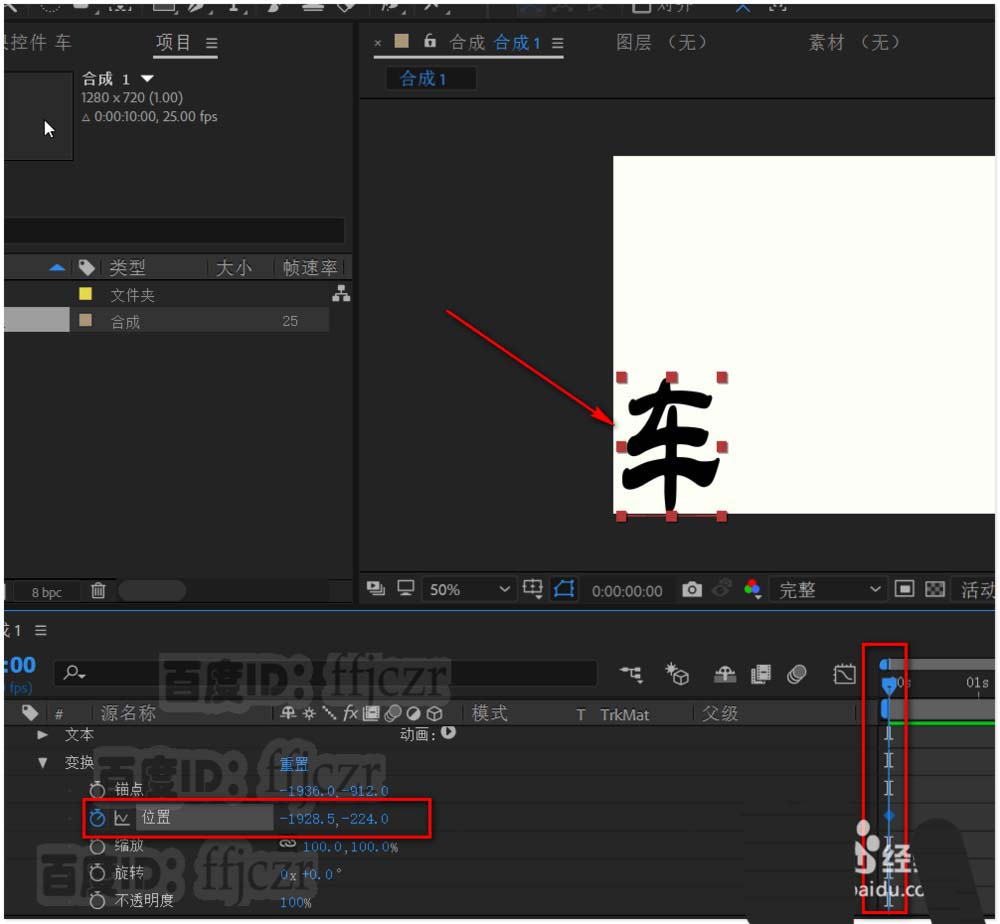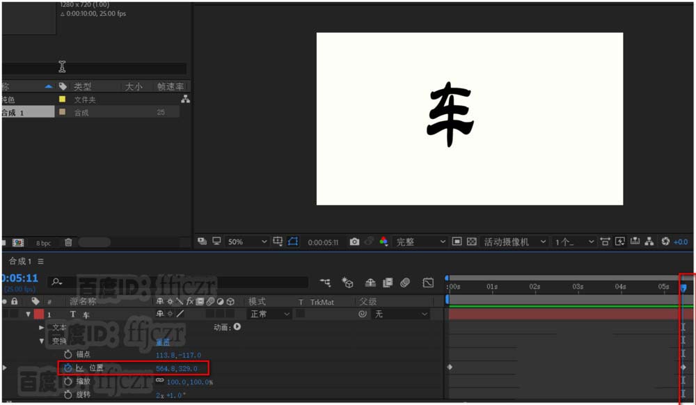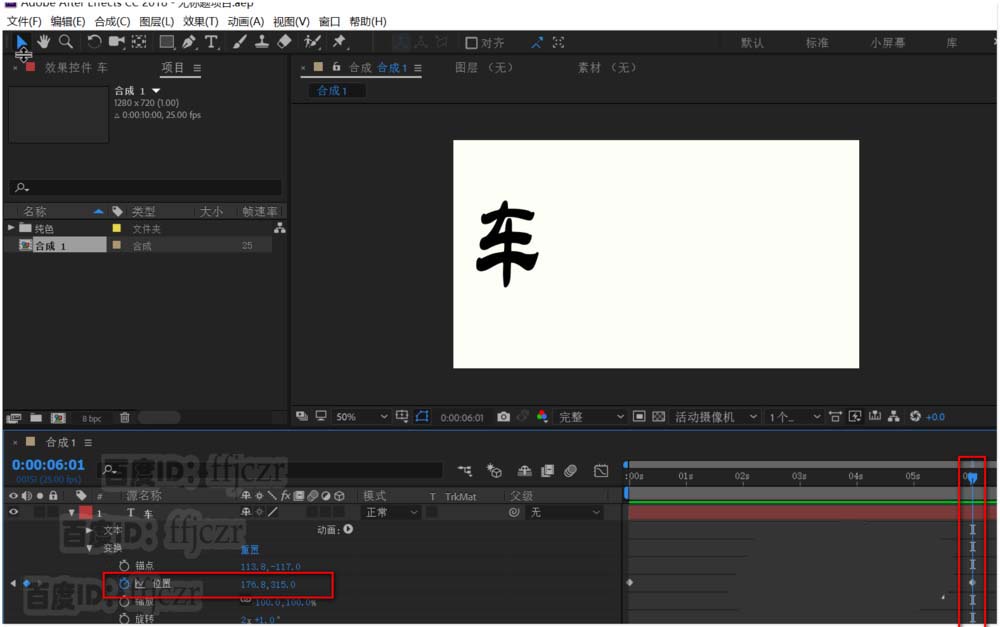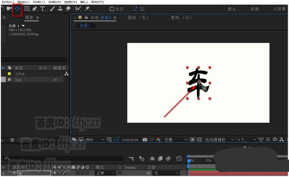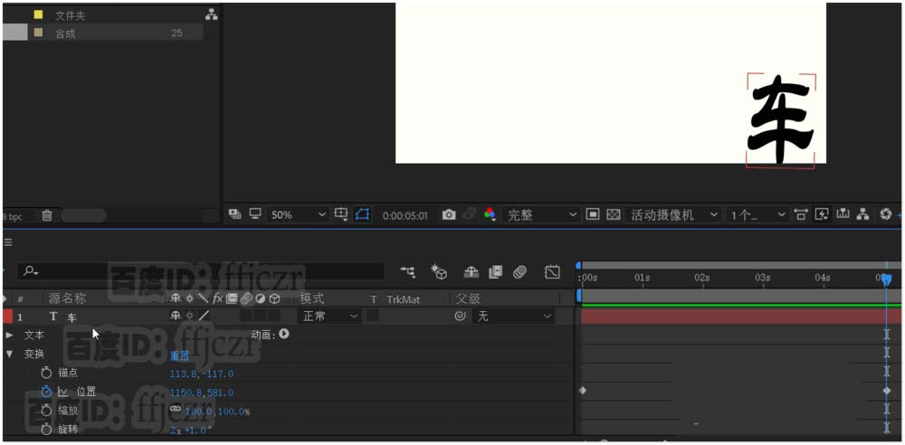 2、新建一個文本層,在顯示區(qū)輸入文字“車”;字體隨意;選用錨點工具將文字的錨點移動到文字中心(按住Ctrl可以更準確的選中文字中心點)