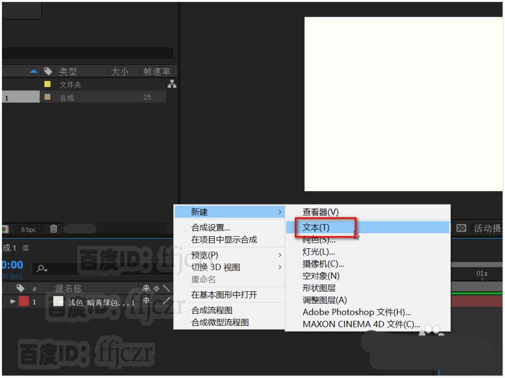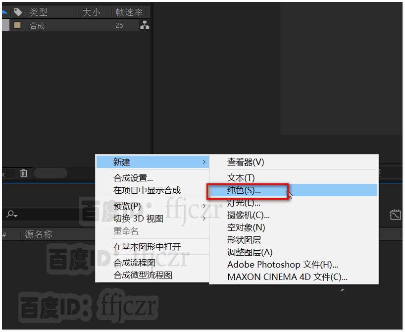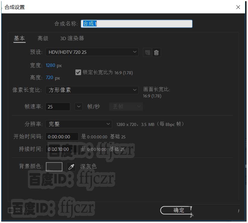 1、新建一個合成項目,分辨率為1280*720;方形像素,25幀率,時間為10秒.在合成層添加一個純色層,顏色隨意。
