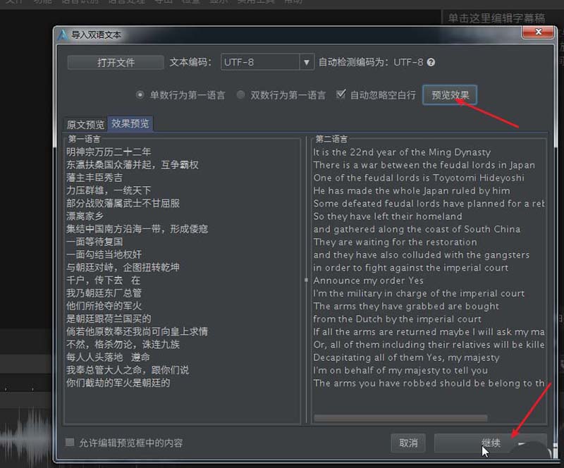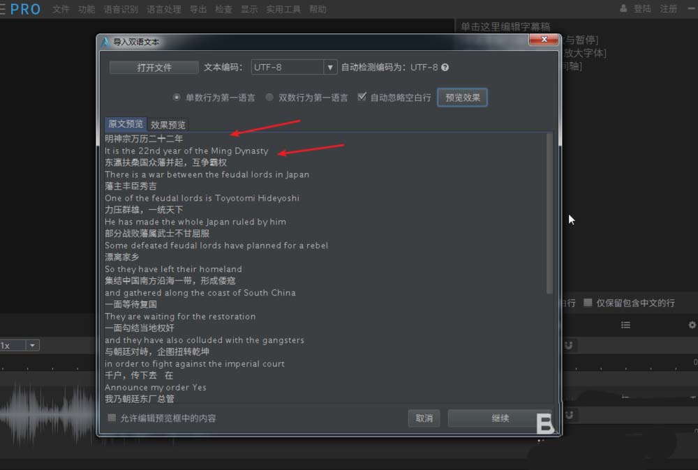 6、來到“導(dǎo)入雙語(yǔ)文本”窗口,看看是否一行一種語(yǔ)言,否則軟件會(huì)提示你修改。