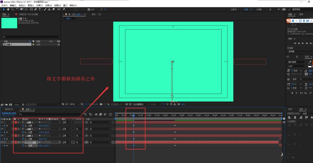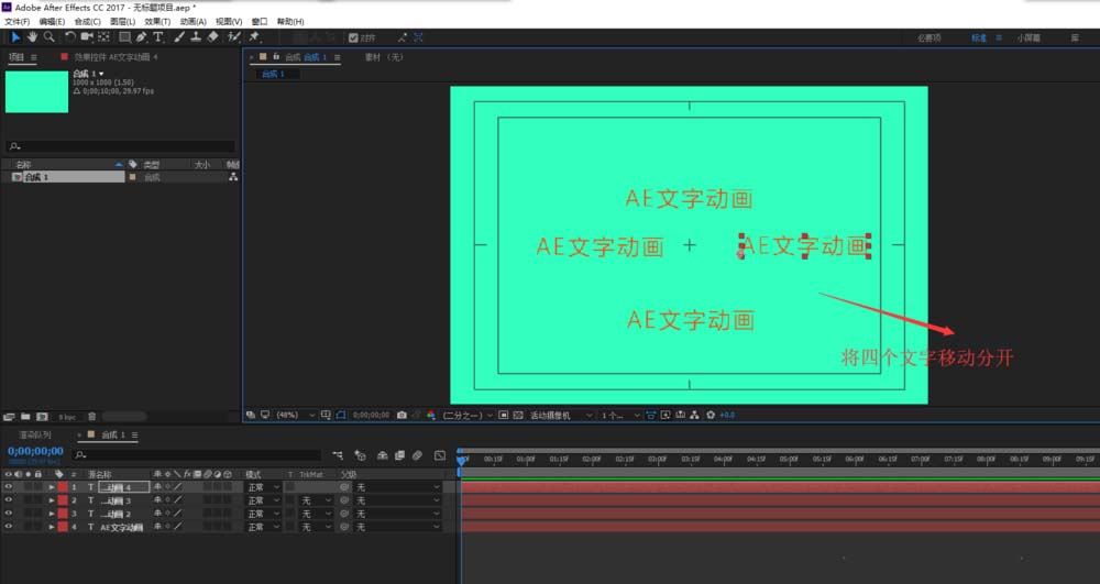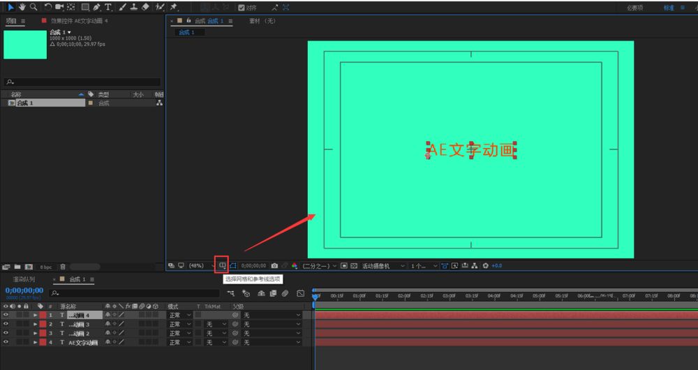 5、在合成1窗口下方打開“標題/動作安全”選項,分別單獨選中四個文字圖層,用選擇工具將這個四個文字分別都移開。