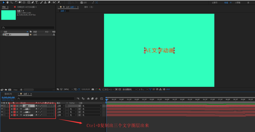 4、選中合成圖層窗口中的文字圖層,直接按鍵盤的快捷鍵Ctrl+D執行文字圖層拷貝操作,在拷貝出三個文字圖層出來。