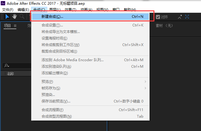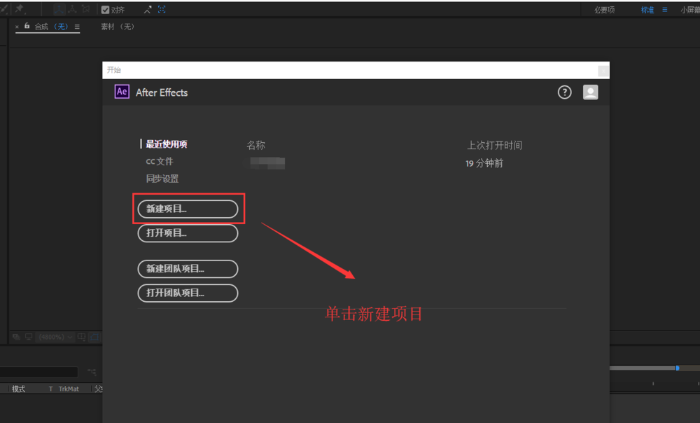 1、找到電腦上安裝的AE軟件或者雙擊AE軟件的快捷圖標,啟動并打開AE軟件,然后在啟動的AE軟件最開始的界面中選擇新建項目選項,創建一個AE項目。