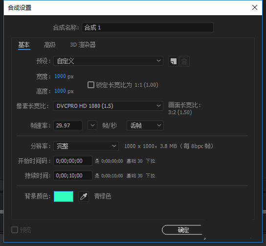2、在AE項目中找到合成菜單欄,點開合成菜單欄,在合成菜單欄中選擇新建合成,彈出合成屬性設置窗口,在合成設置中設置合成的大小等,并將合成背景顏色改一下,不要默認的黑色。