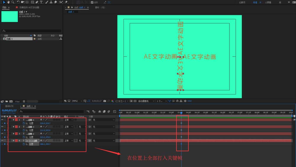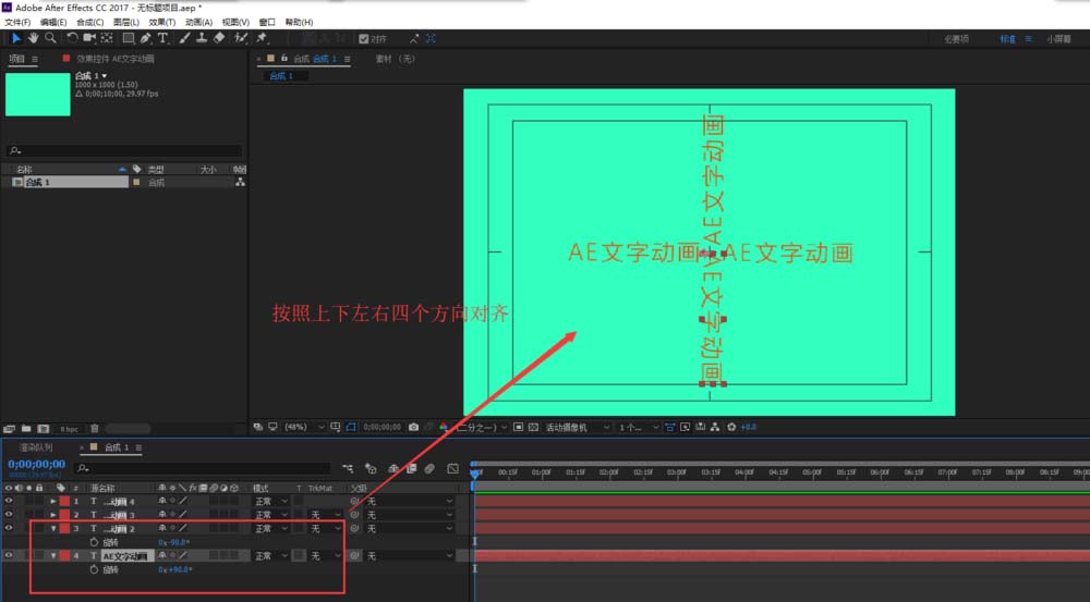 6、選中兩個上下方向的文字圖層,按R打開旋轉,一個旋轉90度,另一個旋轉-90度,在將這幾個文字圖層按照上下左右方向對齊;將時間軸移到合適位置,選中所有圖層按P打開位置,在四個圖層的位置上都打入一個關鍵幀。