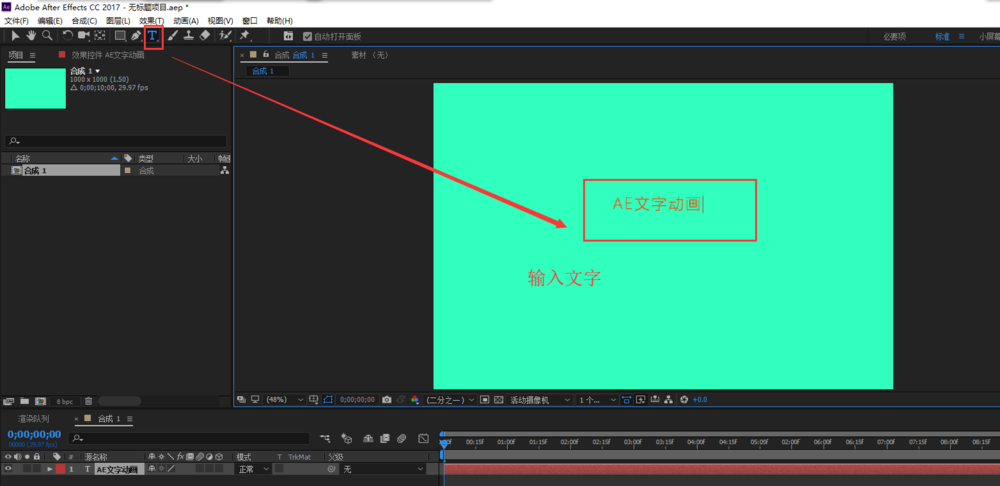 3、選中AE中的文本工具選項,用文本工具在合成場景上單擊并輸入文字內容,打開字符窗口,在字符中設置文字的大小等;并在對齊面板中單擊水平中齊與垂直中齊。