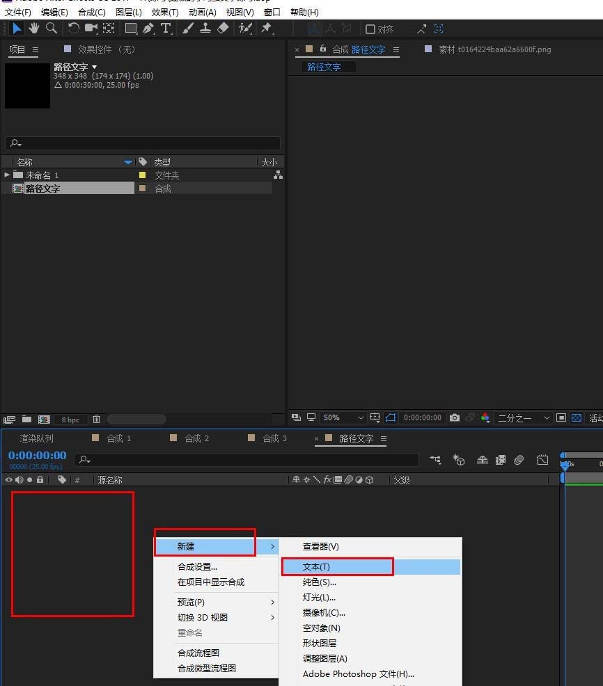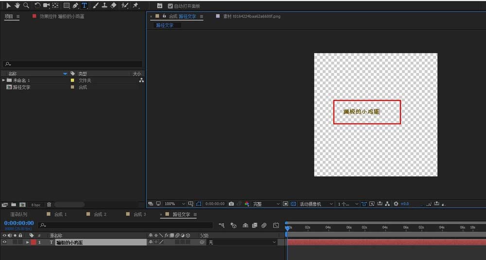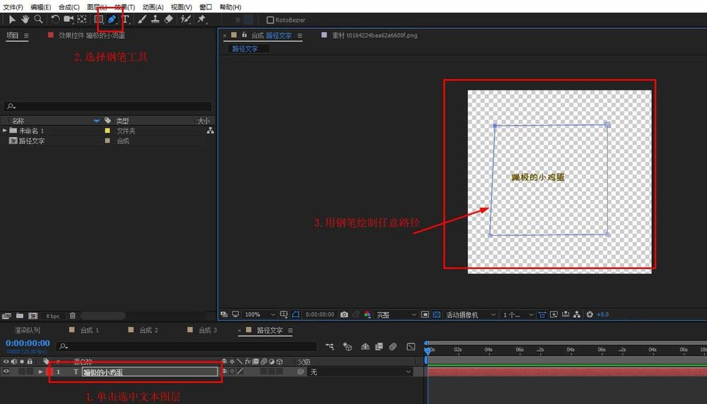 5、單擊文本圖層,然后選擇左上角的鋼筆工具,用鋼筆工具在合成面板中繪制自己需要的路徑。(如圖中的方形路徑)