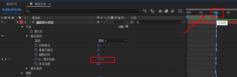7、將時間軸移動到文字運動的結束時間點。更改路徑選項的參數確定文字運動結束的關鍵幀。